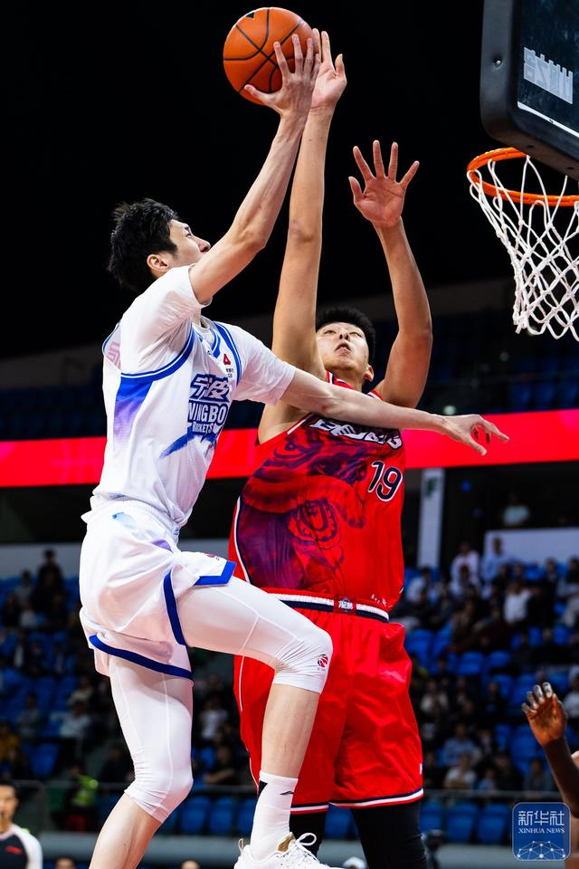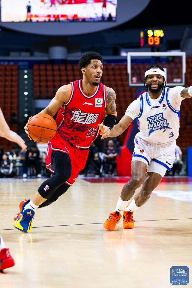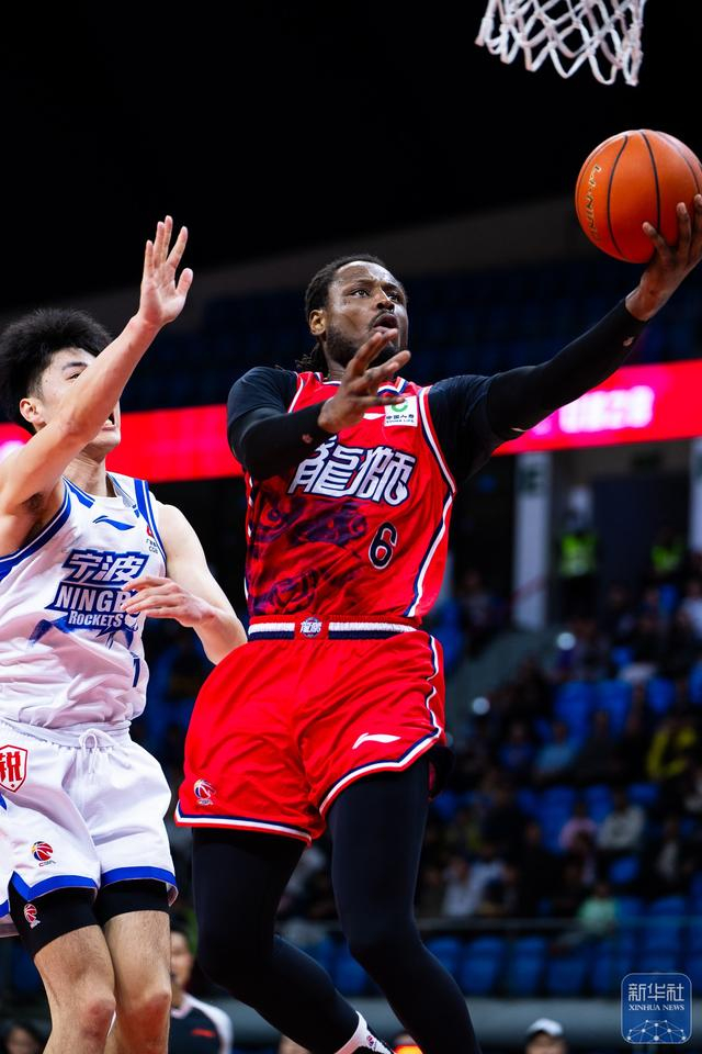 ↑ 宁波町渥队球员罗凯文(前)在广州朗肽海本队球员徐昕的防守下上篮。