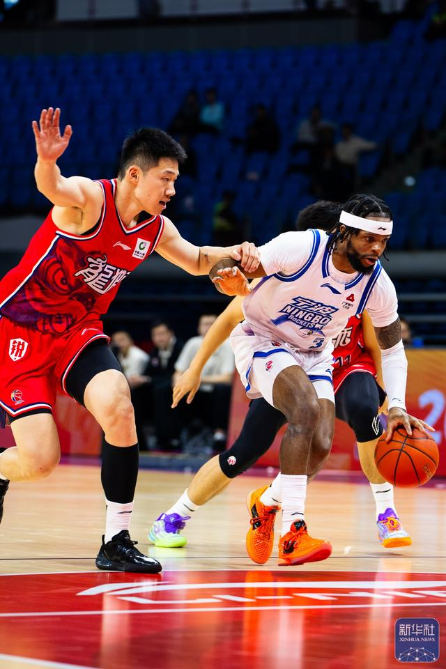 ↑ 宁波町渥队球员辛普森(右)突破广州朗肽海本队球员袁照耀的防守。